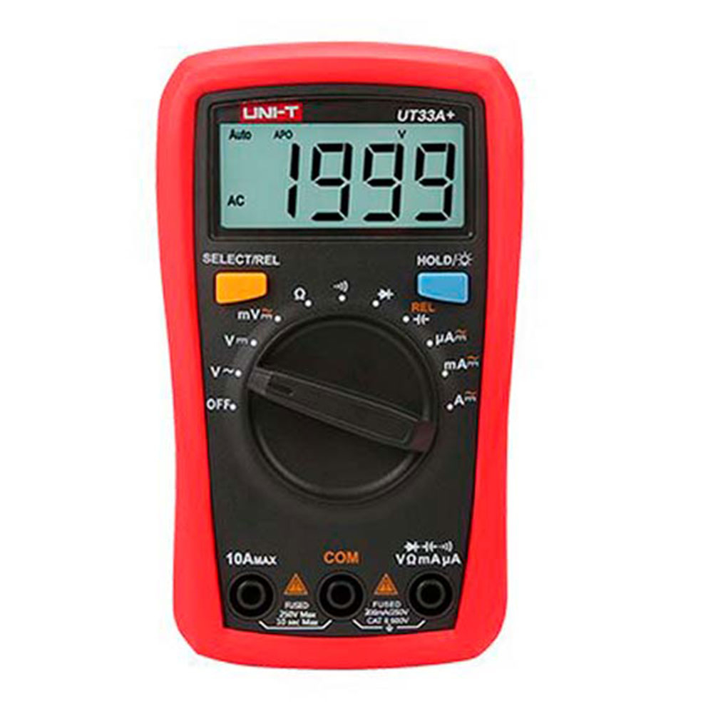 UNI-T UT33A+ – это надежный и точный карманный цифровой мультиметр, оснащенный прочным защитным чехлом и большим ЖК-дисплеем. Устройство позволяет измерять постоянное и переменное напряжение, постоянный и переменный ток, сопротивление и емкость, а также используется для тестирования диодов и прозвонки цепи.