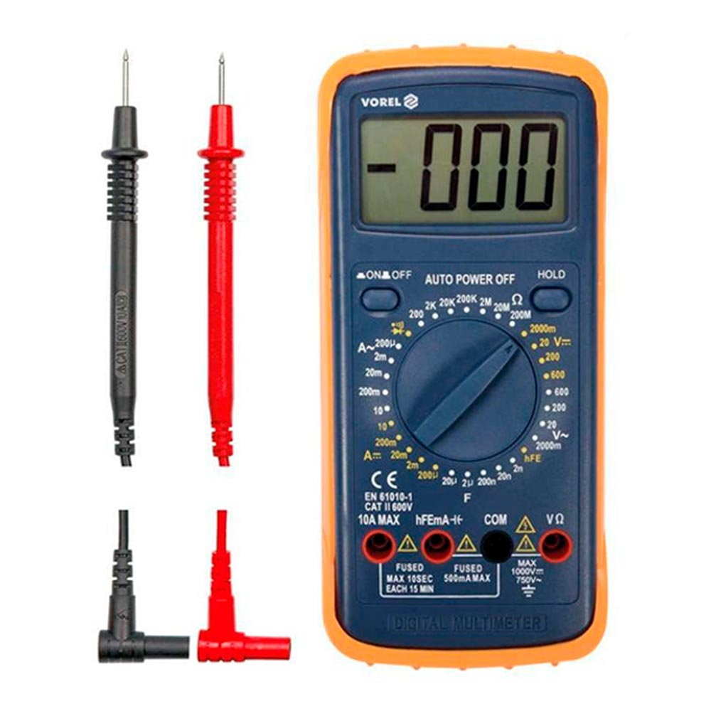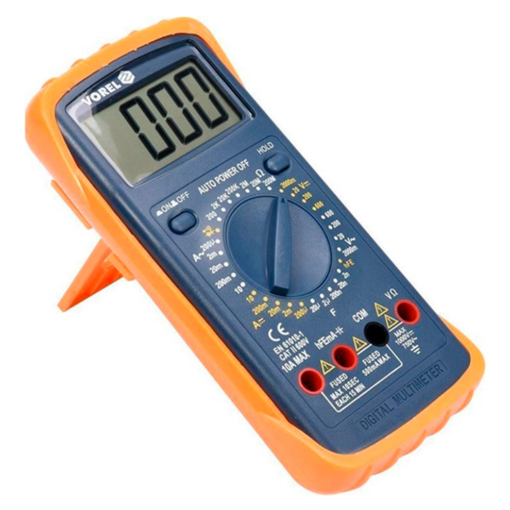 Цифровой мультиметр универсальный VOREL 81783 способен измерять напряжение постоянного и переменного тока, сопротивление, емкость конденсаторов, частоту тока и температуру, а также позволяет проверять диод. Корпус пластиковый. Благодаря силиконовой крышке, повышается устойчивость к ударам. Мультиметр имеет большой ЖК дисплей. Функция автоматического отключения мультиметра экономит заряд батареи.