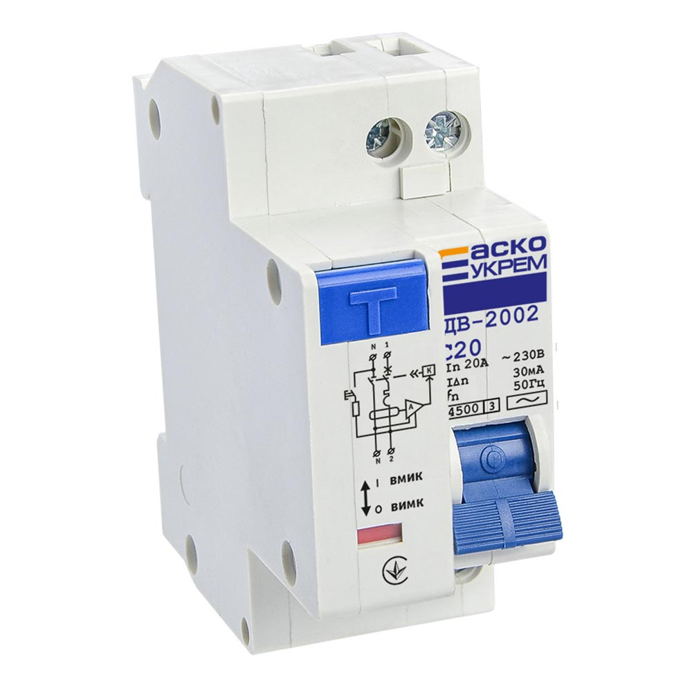 Автоматичний вимикач диференціального струму АСКО-УКРЕМ ДВ-2002, 2р, C 20А/30мА, A0030010006
