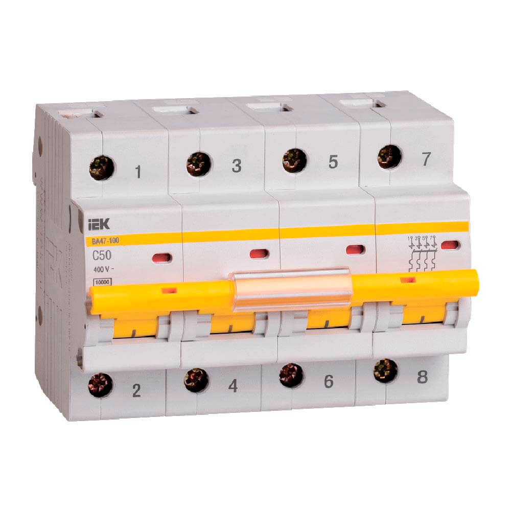 Автоматичні вимикачі IEK ВА47-100 (MVA40-4-050-C) призначені для захисту розподільчих і групових ланцюгів, що мають активне та індуктивне навантаження. Рекомендуються до застосування у ввідно-розподільних пристроях побутових і промислових електроустановок. Два типи захисту від перевантаження і короткого замикання.