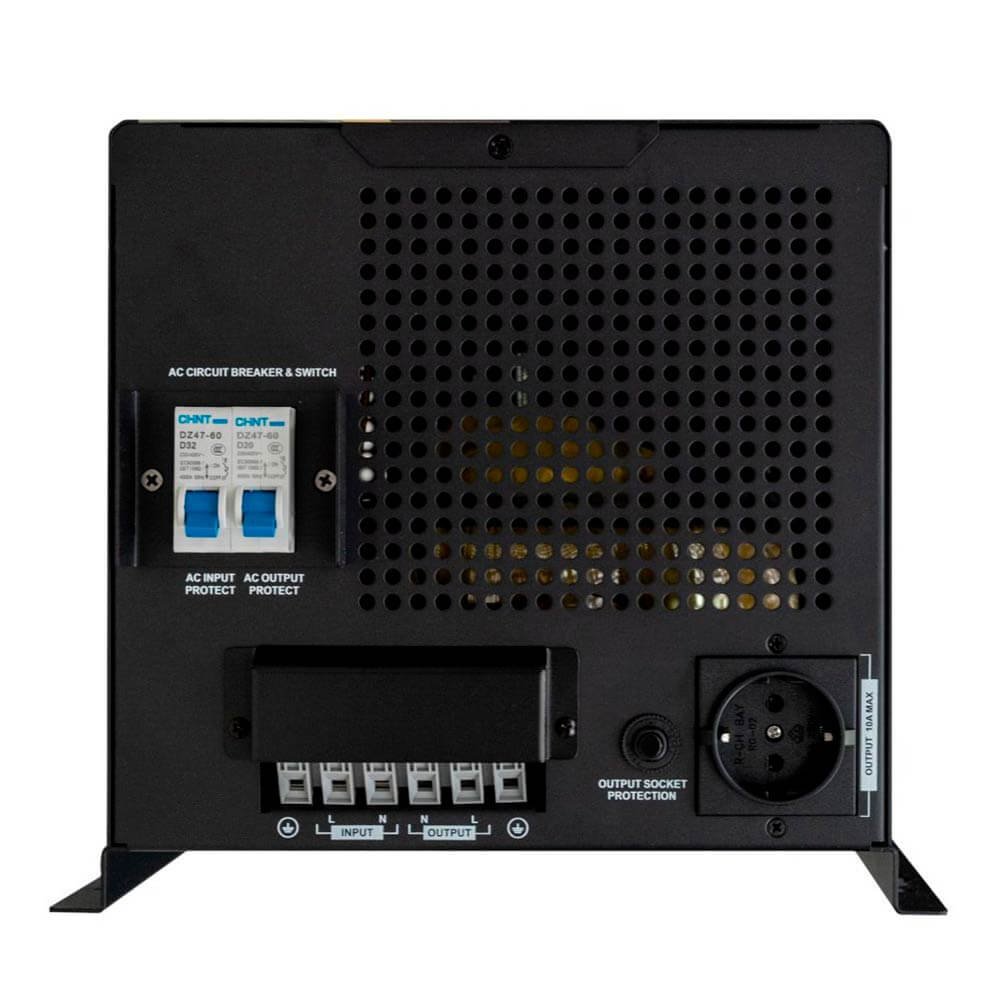 напруга акумулятора – 24 вольт, номінальна/активна потужність навантаження – 3000 Вт/4500 Ва, струм заряду – 5-45 ампер, форма сигналу – чистий синус,