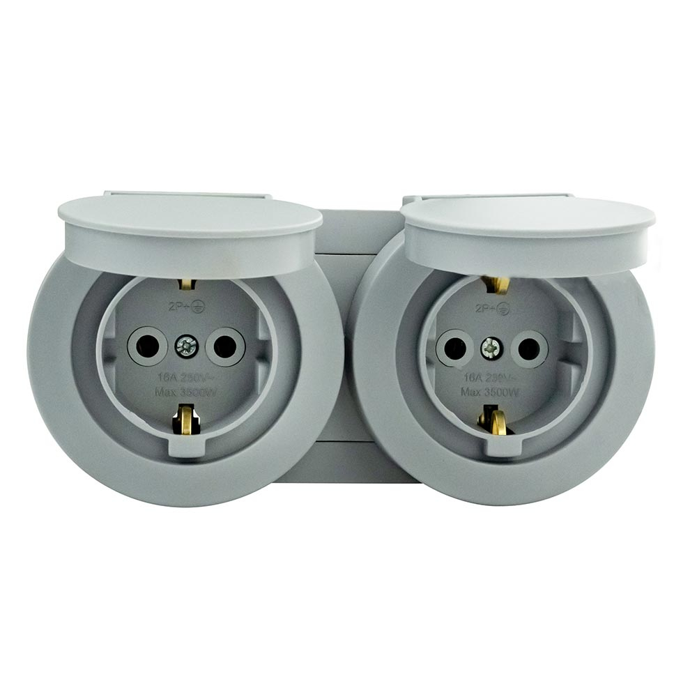 Розетка накладна HOROZ xOne 2-а, з з/к, з кришкою, 16А, IP54, сіра, 406-240000-924