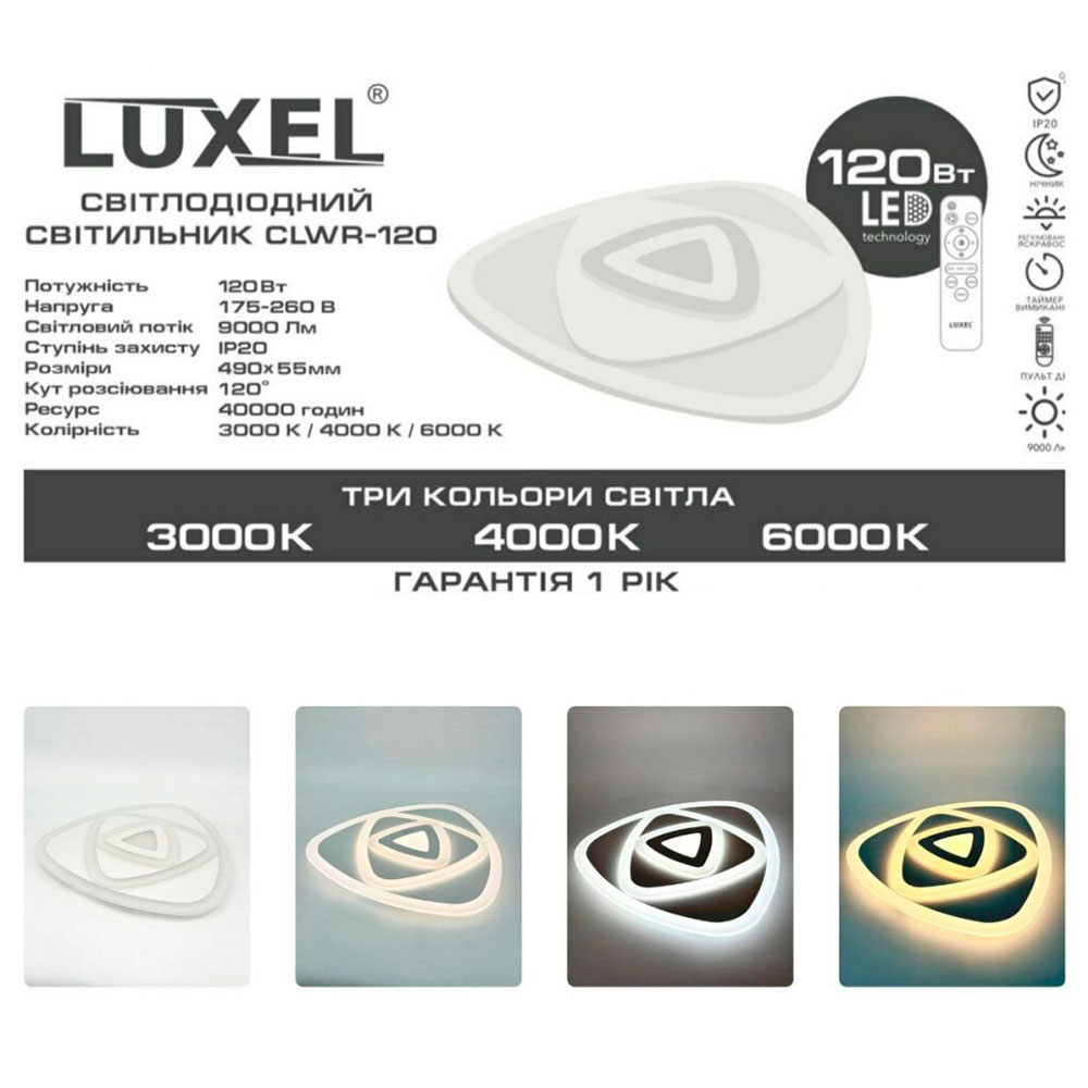 Світильник Luxel CLWR-120 120Вт з пультом керування, таймер, рег. світла, нічник, 3000/4000/6000К