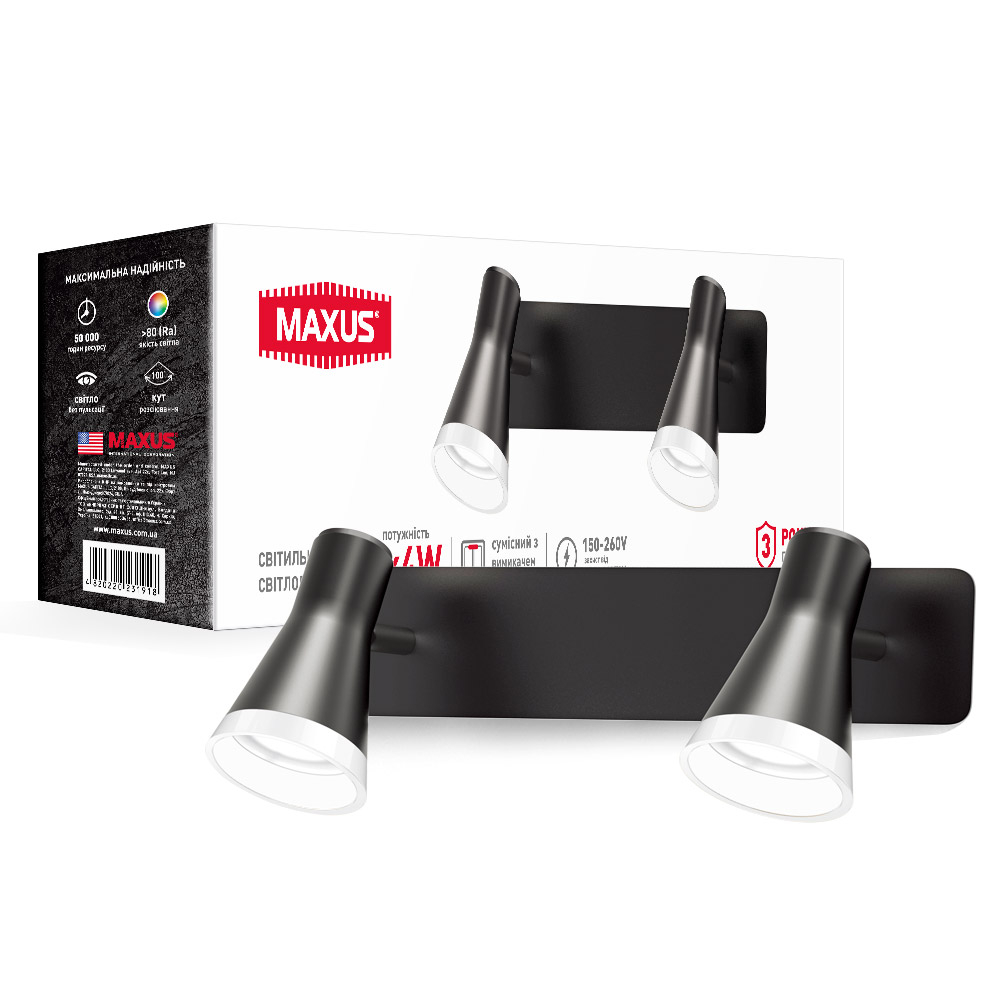 Ви можете придбати Спотовий світильник на 2 лампи MAXUS MSL-02W 8W 4100K чорний, 2-MSL-20841-WB та багато інших товарів у інтернет-магазині “Електропроводка” вигідно, за суперціною, з доставкою, у Запоріжжі, Києві та Україні зробив замовлення на сайті або зателефонувавши нашим менеджерам по телефонам, вказаним у розділі "Контакти"