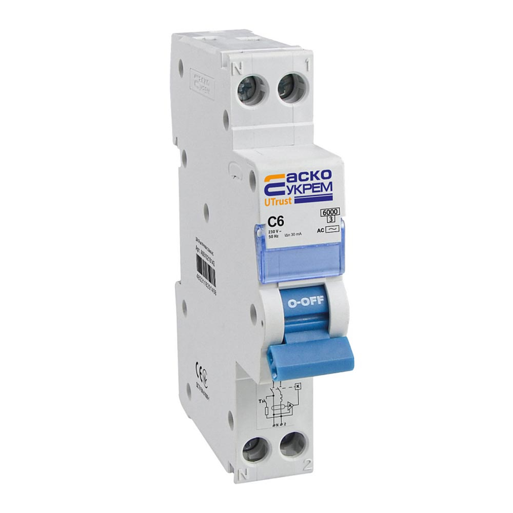 Пристрій захисного вимкнення ДВ АСКО-УКРЕМ UTrust 1P+N (18 mm) 6А C 30mА AC, A0010210142
