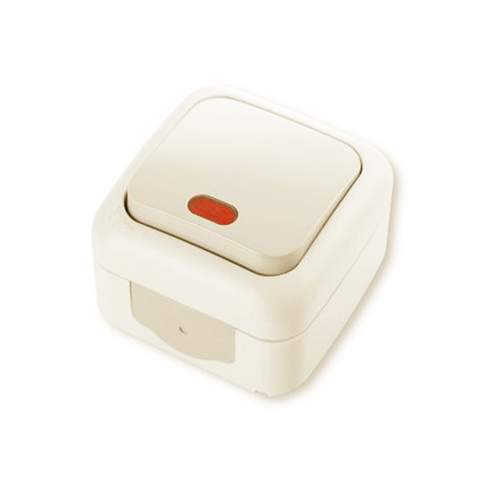 Корпус изготовлен из высококачественного термостойкого поликарбоната, клавиша выключателя произведена из ABS-пластика кремового цвета. Встроенные защитные манжеты обеспечивают корпусу хорошую влагозащиту. Выключатель для открытой проводки монтируется на ровную стеновую поверхность.