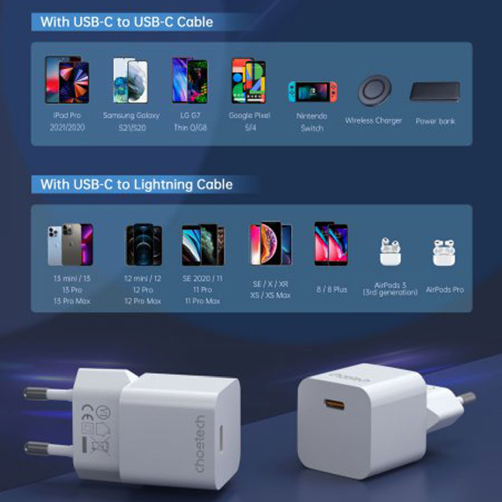 Зарядное устройство сетевое Choetech PD5010-EU-WH, GaN, USB-C, 20Вт, QC3.0/PD/PPS